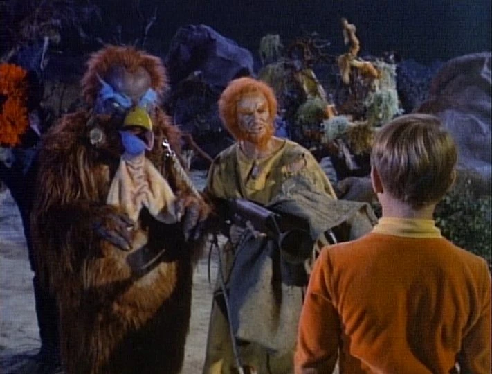 Will then sneaks outside to have a look around on his own. He is confronted by the same giant bird and an orange-haired man called Tiabo, who is not at all happy to see him. Tiabo, stating he is part of a military force, is convinced Will is part of an invasion fleet and locks him up in a cave where Smith and the Robot are waiting. Tiabo warns that if anyone tries to leave the cave, the giant bird will eat them. He then scurries off to contact his superiors.