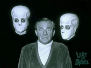 Inside the ship two aliens question Dr. Smith. They are in need of a humanoid brain to repair their ship's guidance system. Since size is a factor, the aliens propose removing a portion of Smith's brain, but he quickly suggests a better alternative — that of Will Robinson's. To ensure his cooperation, the aliens place a metal ring around his neck and release him. Smith soon learns that the collar causes him excruciating pain when he delays in his task.