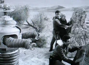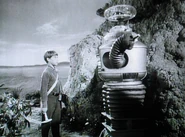 - During the final scene, as the Robot is seen walking among the rocks near the alien spaceship, Bob May's legs can be seen sticking out of the bottom of the Robot's costume.