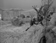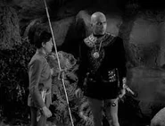 The next day, Quano reappears and stares at them. He believes Earth people are stupid and weak, especially the females. Quano informs the Robinsons that his father is the Ruler of his planet, and that he himself is a prince. Doctor Smith gets very excited and tries to ingratiate himself to Quano, but the boy will have none of it. Quano invites Will to go hunting with him, and as they walk, Will stops to examine rocks. Quano makes fun of such pursuits and tells Will that he has come to their planet to test his strength and bravery. He takes Will to a nearby cave where a monster lurks. Quano calls to the monster so they can fight it, but as it comes toward them, Quano trips on a rock and is knocked unconscious. Quano’s father arrives in time to save them and commends Will for his bravery and for going back to help his injured son in the face of danger, but the humiliated Quano becomes jealous and angry.