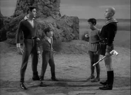 Quano arrives and informs the Robinsons that the challenge will start at dawn. If they fail to arrive, it will be taken as an act of cowardice and a the family will suffer a penalty. Smith tries to bribe Quano into taking him back to Earth, but the boy thinks Smith is a traitorous scoundrel and orders him never to speak to him again. When morning comes, Smith, John, Don and Will to go the competition. The challenge begins with a test of strength in which Quano proves to be the victor. The second challenge is a test of fear, followed by a test of dexterity, and a test grip. By the time the final challenge is at hand, the two boys are tied. Dr. Smith makes one last attempt to ensure Will does not win by trying to convince him to throw the contest on the pretext that perhaps the Ruler will return them to earth, but Will refuses to cooperate. The Ruler also has a talk with his son. He does not think Quano is doing well enough, and that Will will be victorious. Therefore, he insists that the last contest be between himself and John Robinson. The two men duel with electric swords, and although the battle is close, John wins in the end.