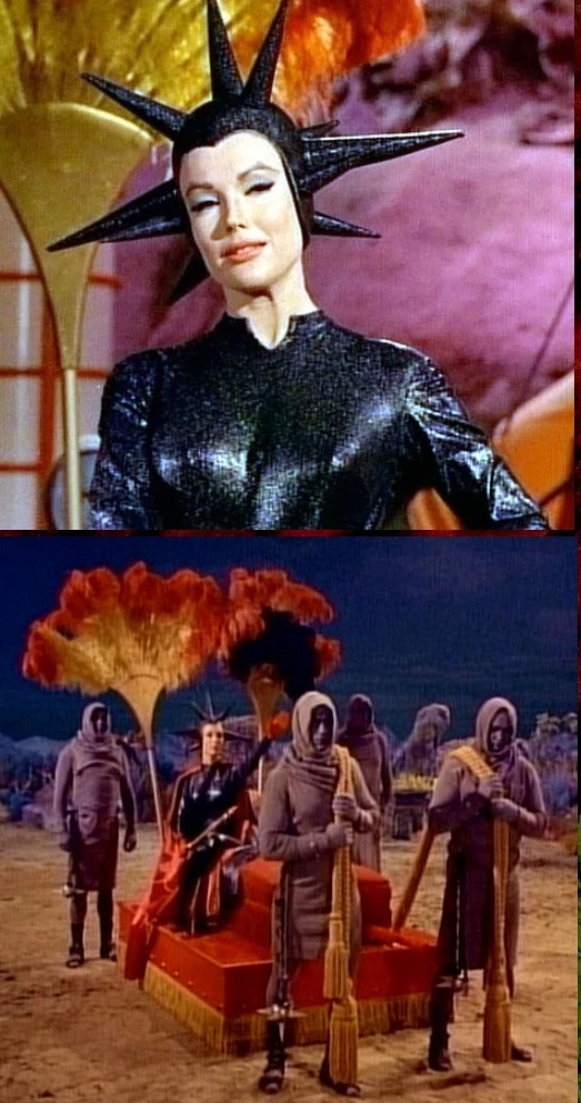 When Will and the Robot find a cave full of electronic equipment they attempt to destroy it, but are stopped by Niolani, leader of the invasion. She reveals that she is the vanguard of a colonization party. She then goes to the Jupiter 2 and tells John and Maureen that she is holding their son captive and that they must surrender. To prepare for the arrival of the colonists, the men will work as slave laborers building a gate that will acclimatize the new arrivals to the planet’s atmosphere. On her planet, since women are regarded as superior, the Robinson women are to be reeducated for their new roles.