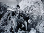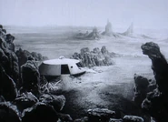 - An overhead panorama of the Jupiter II campsite is shown. The view looks as though the spaceship has been gently lowered down and carefully placed amidst an alien rocky outcrop, instead of the aftermath of an out of control, pancake crash landing (well sort of) seen in “Island In The Sky” (ep3). This background of rocks doesn’t appear to match any of the close-up scenes viewed around the spaceship either.