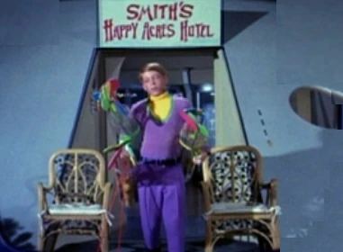 The four aliens (two male, two female) transport down to the planet in clever human disguises along with a brain-washed Mr. Zumdish as their travel director. Zumdish speaks to Smith, insisting that his guests be shown a wonderful time, and threatening to leave without paying if things are not satisfactory. Dr. Smith assures Zumdish that “Happy Acres” is the best hotel there is.